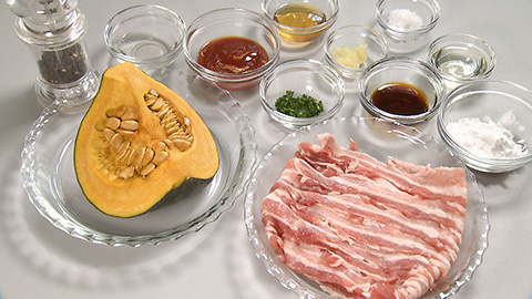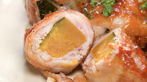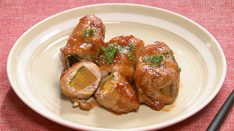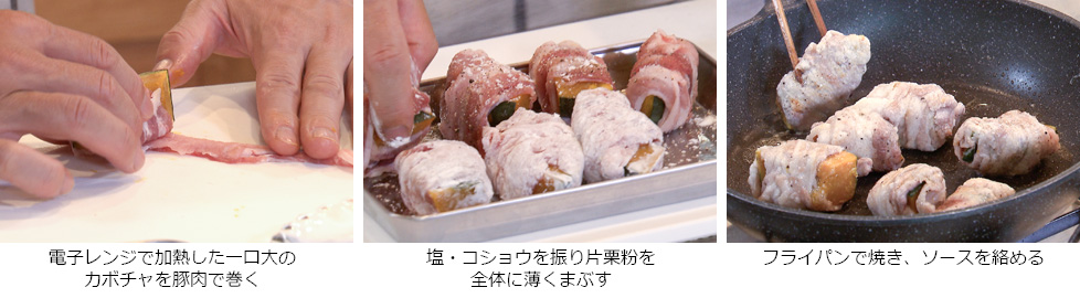 - 「2.」を豚肉で巻いて塩・コショウを振り片栗粉を全体に薄くまぶす。