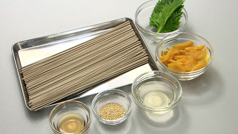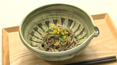 しっかり水切りした蕎麦をボウルに移し、すし酢、ゴマ油を加えて全体を和える。