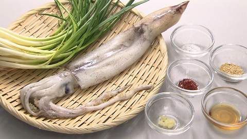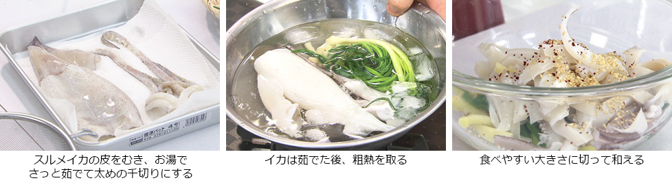 (ゲソ・胴・えんぺらをできるだけ皮をむき、お湯でさっと茹でて太めの千切り)