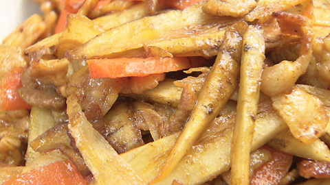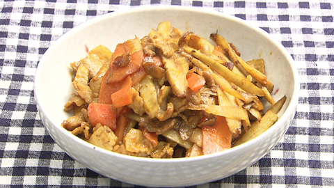- ある程度火が通ってきたらゴボウとニンジンを加えて炒めていき、しんなりしたらケチャップとソースで味付け。