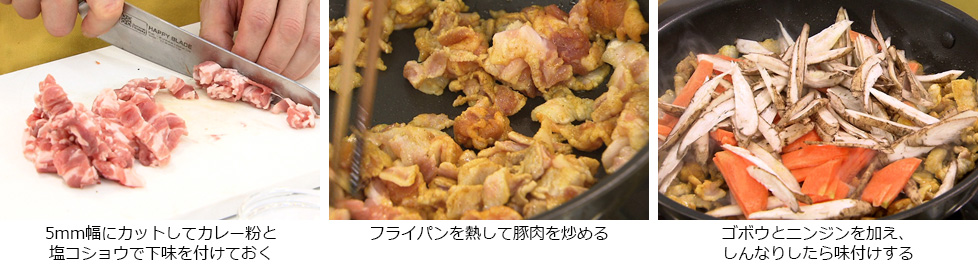 - フライパンを熱してサラダ油をひき、下味をつけた豚肉を炒める。