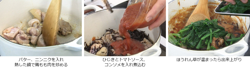 - 鶏肉の色が変わってきたら水で戻したひじきとトマトソース、固形コンソメを入れ、フタをして10分煮込む