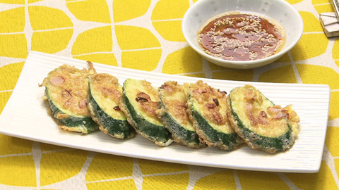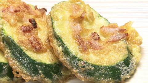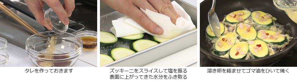 - 小麦粉をまぶしたズッキーニに 溶き卵を絡ませゴマ油をひいたフライパンで焼く。