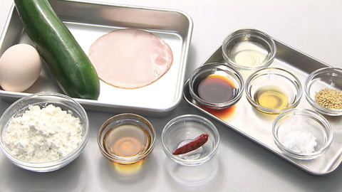 - ズッキーニの上にハムと鷹の爪をのせ、上から溶き卵をかける。両面に軽く焦げ目がつくまで焼ければ完成。