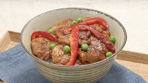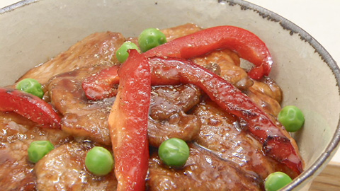- ご飯の上に肉と赤パプリカを盛り付け、彩りにグリーンピースを散らし、余ったたれをご飯にかければ完成。