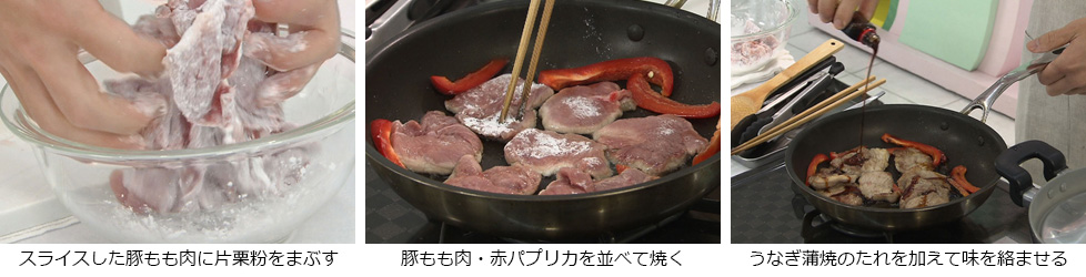 - サラダ油をひいたフライパンに、豚もも肉・赤パプリカを重ならないように並べて焼く。