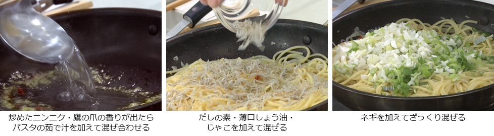 - 塩 … 大さじ2(パスタ鍋に入れパスタを茹でる)
