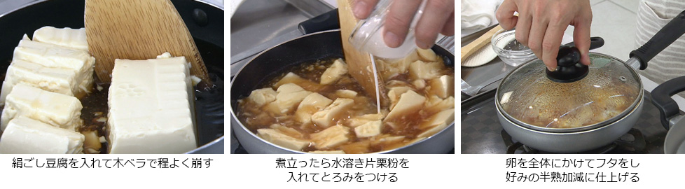 - そこに絹ごし豆腐を入れて木ベラ等で程よく崩す。