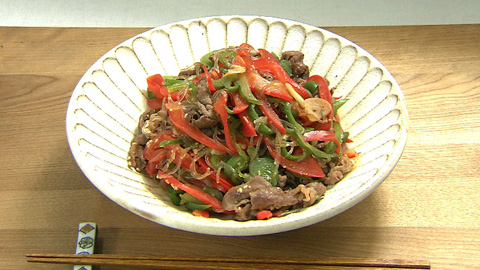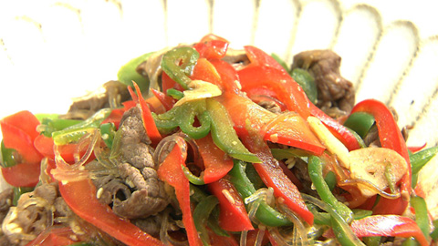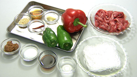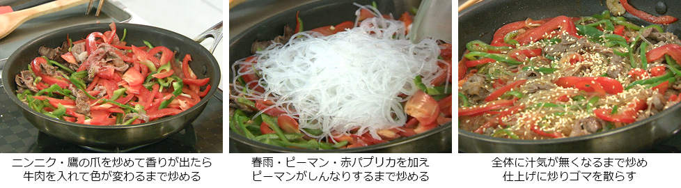 - 春雨・ピーマン・赤パプリカを加え、ピーマンがしんなりするまで炒める。