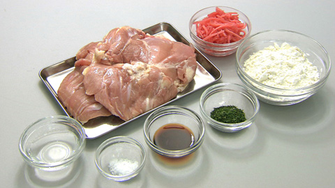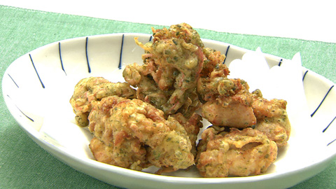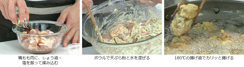 - 180℃の揚げ油で、衣を絡ませた鶏肉をカリッと揚げて完成。