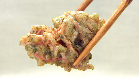 - ボウルで天ぷら粉と水を混ぜ、紅ショウガ・青のりを加えさらに混ぜる。