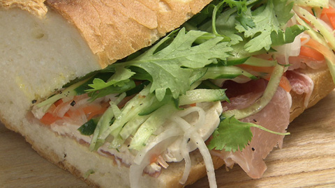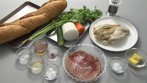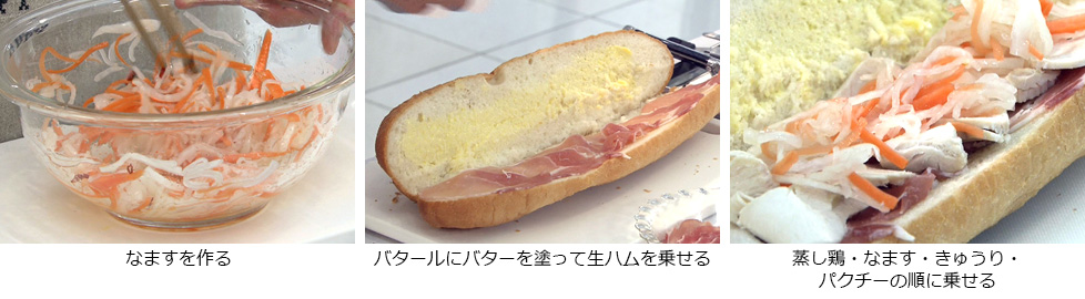 - さらに、蒸し鶏・なます・きゅうり・パクチーの順に乗せる。