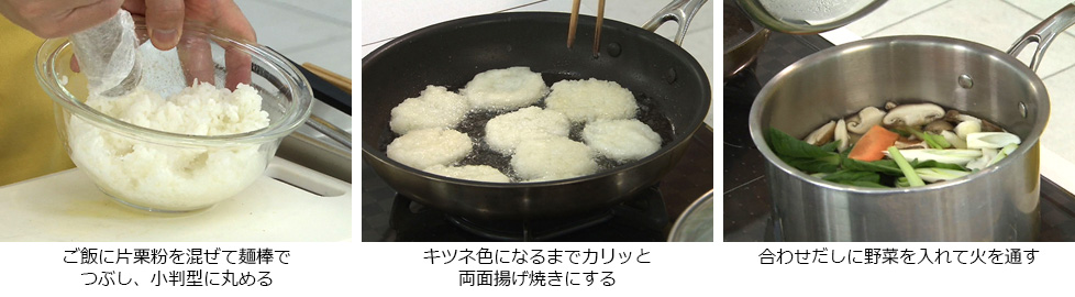 - ご飯に片栗粉を混ぜて麺棒でつぶし、小判型に丸める。