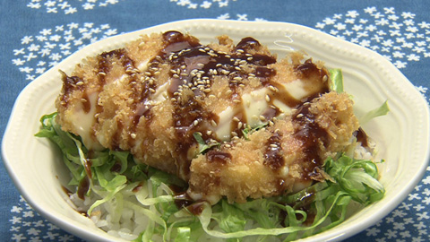 - 少し冷ましてから食べやすくカットし、レタスを乗せたご飯の上に盛り付ける。