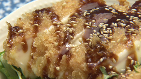 - ソースとケチャップを混ぜた特製ソースをかけ、仕上げに炒りゴマを振ったら完成。