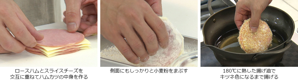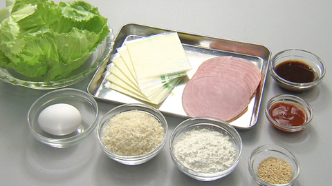 - ロースハム4枚とスライスチーズ3枚を交互に重ねハムカツの中身を作る。