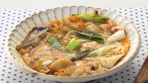 - とき卵を回しかけフタをして約1分加熱。半熟になったらお皿に滑らせるように盛り付ける。