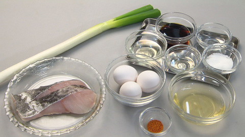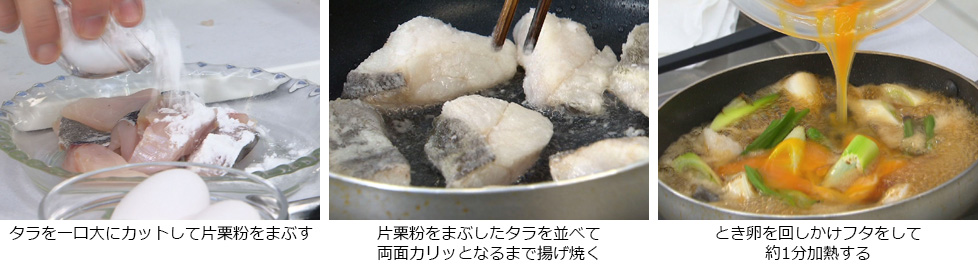 - フライパンにサラダ油をひいて熱し、片栗粉をまぶしたタラを並べ両面カリッとなるまで揚げ焼く。
