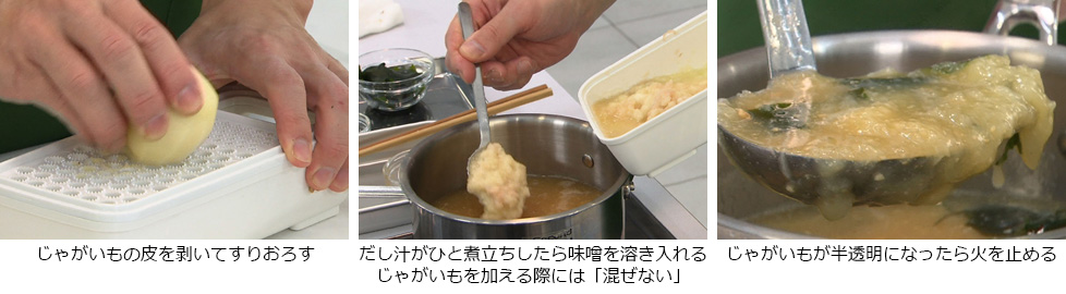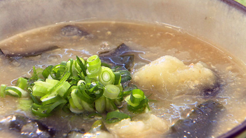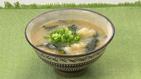 - 鍋にだし汁を入れて火にかけ、ひと煮立ちしたら弱火にして味噌を溶き入れる。