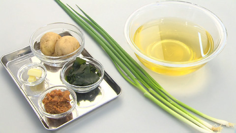 - わかめ と すりおろしたじゃがいもを入れて(混ぜない)フタをして蒸らすように加熱、じゃがいもに火を通す。