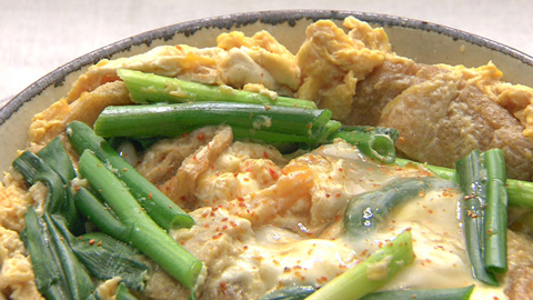 - 半熟状態になったらご飯のうえに滑らせるように盛り付ける。