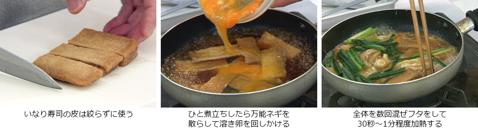 - 小さめのフライパンにだし汁・しょう油・おろしショウガ・いなり寿司の皮を入れて火にかける。
