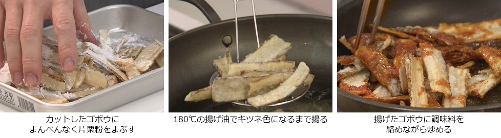 - カットしたゴボウにまんべんなく片栗粉をまぶす。