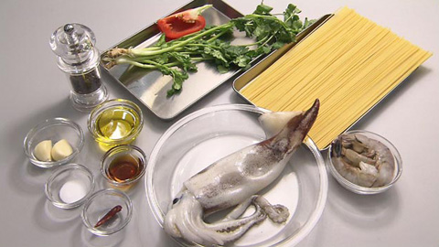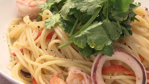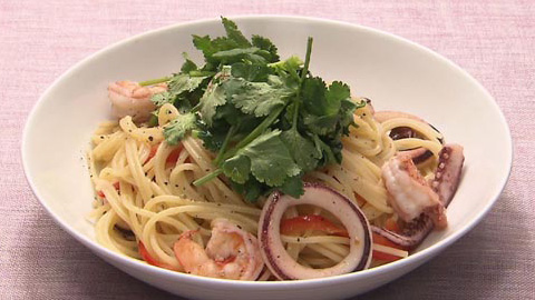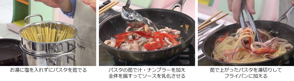 - イカに色が付いてきたらパスタの茹で汁・ナンプラーを加え全体を揺すってソースを乳化させる。