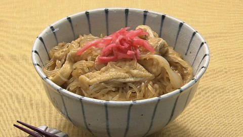 - 丼にご飯をよそい、煮た具をたっぷりと乗せ、煮汁も適量かける。