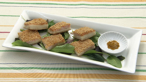 (フライパンだったので、ゴマをまぶした面から揚げました)