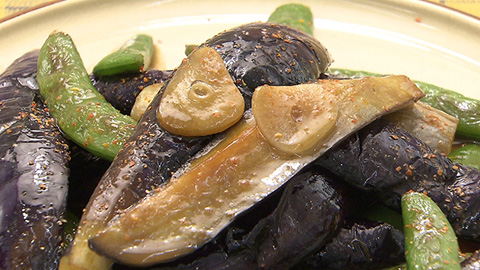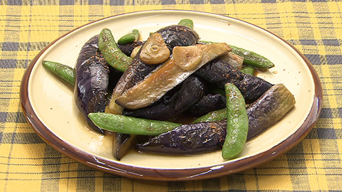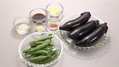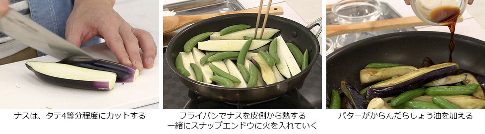 - フライパンに多めのサラダ油をひいて熱し、ナスを皮側から、一緒にスナップエンドウに火を入れていく。