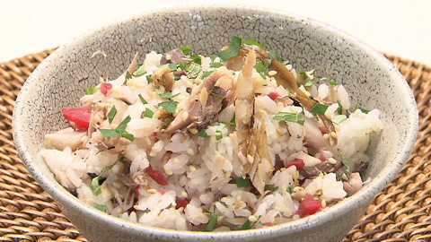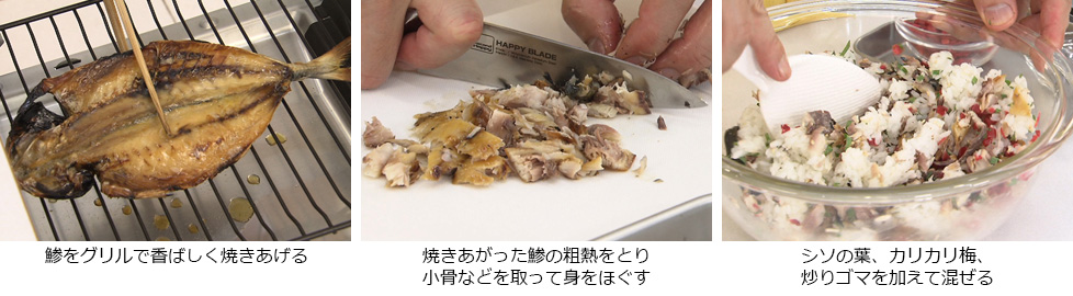 ボウルにご飯を入れ、ほぐした鯵の身、シソの葉、カリカリ梅炒りゴマを加えて混ぜる。