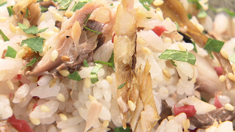 焼きあがった鯵の粗熱をとったら、小骨などを取って身をほぐす。