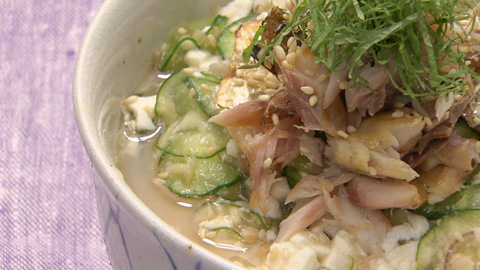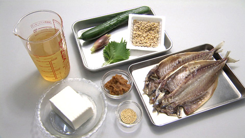 - ボウルに、小口切りしたキュウリ、豆腐、ひき割り納豆、味噌を入れ、だし汁を少しずつ加えながら混ぜていく。
