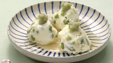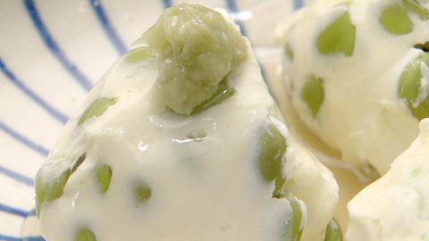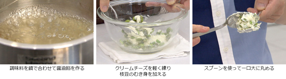 - ボウルにクリームチーズを軽く練り、枝豆のむき身を加えて混ぜ合わせる。
