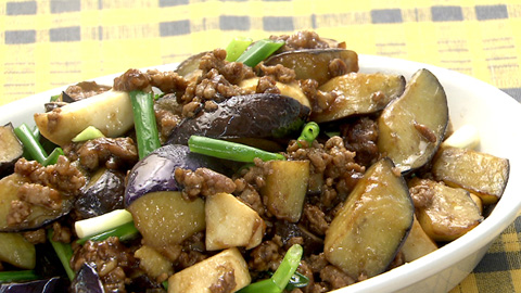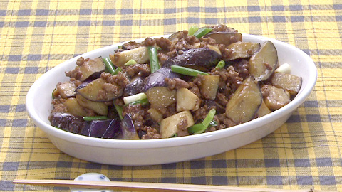 - 香りが出たら豚ひき肉をしっかり炒め、ナス・エリンギ・テンメンジャン・オイスターソース・酒・醤油・砂糖で味付け。