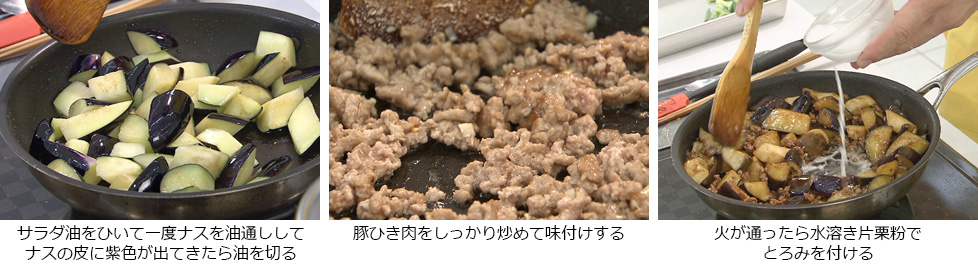 - フライパンに多めのサラダ油をひいて一度ナスを油通し。ナスの皮に紫色が出てきたら油を切る。