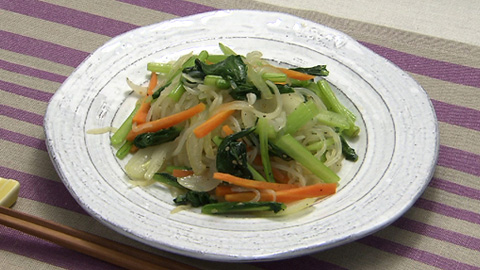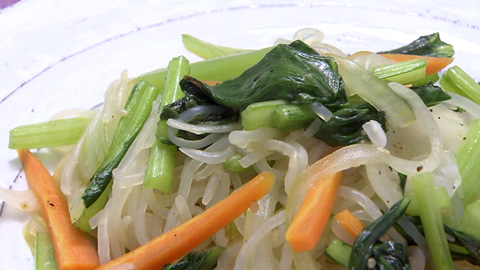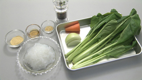 - 鶏がらスープの素、炒りゴマをふりかけ、コショウで味を調える。