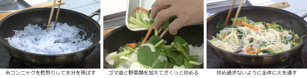 - フライパンを火にかけ、糸コンニャクを乾煎りして水分を飛ばす。