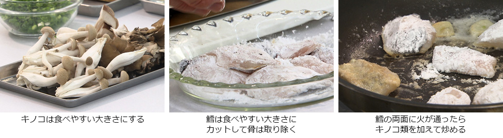 - 鱈は、食べやすい大きさにカット。じゃまな骨は取り除いてさらに食べやすく。カットしたら軽く塩コショウをして片栗粉をまぶす。