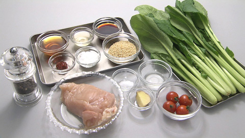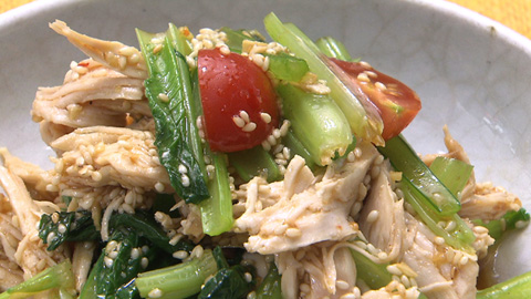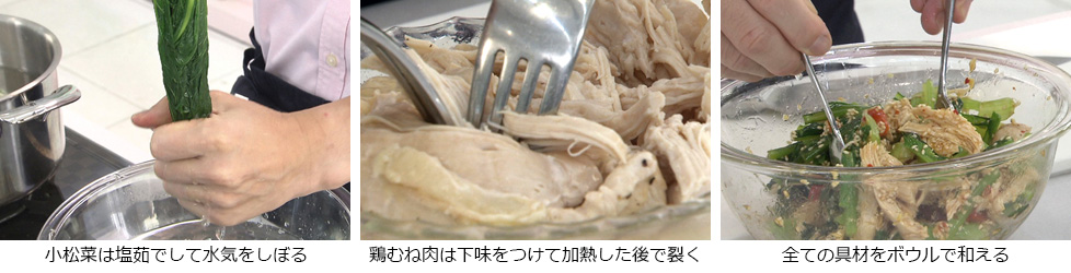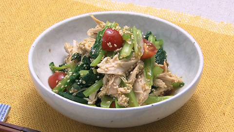 - 裂いた鶏肉と切った小松菜、トマトをボウルに加え、味が全体にわたるように和えて完成。