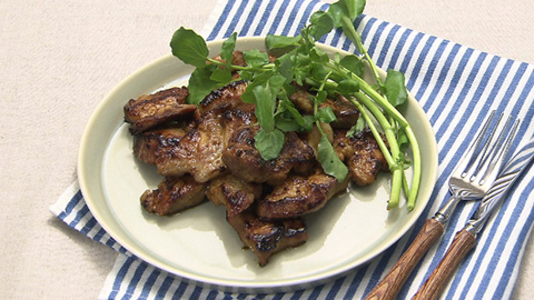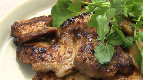 - 焼きあがったら皿に盛りつけ、クレソンを添えて完成。