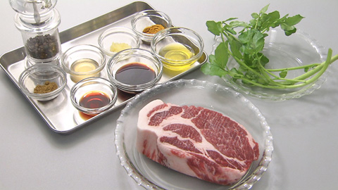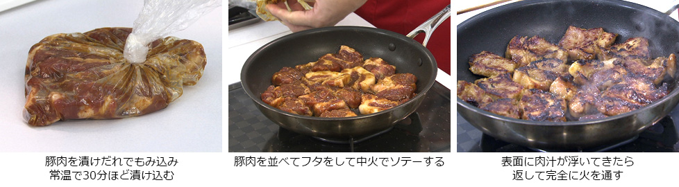 - フライパンに漬け込んだ豚肉を並べてフタをして中火でソテーする。