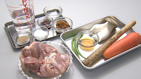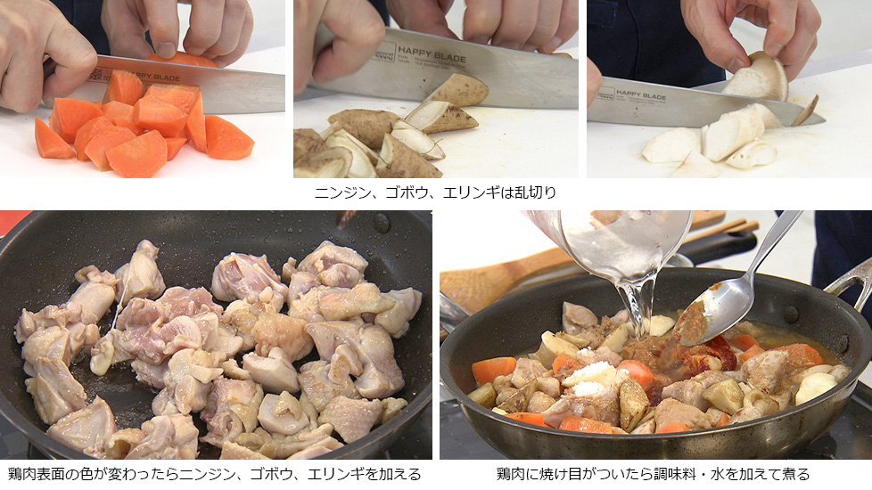 - 鶏肉に少し火が入り表面の色が変わってきたらニンジン、ゴボウ、エリンギを加えてさらに炒める。