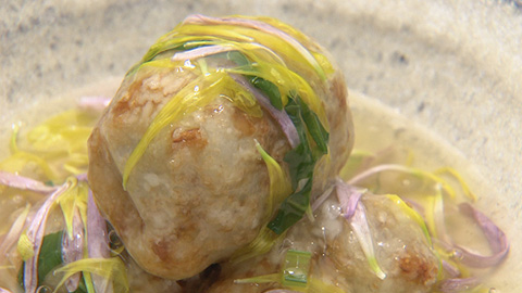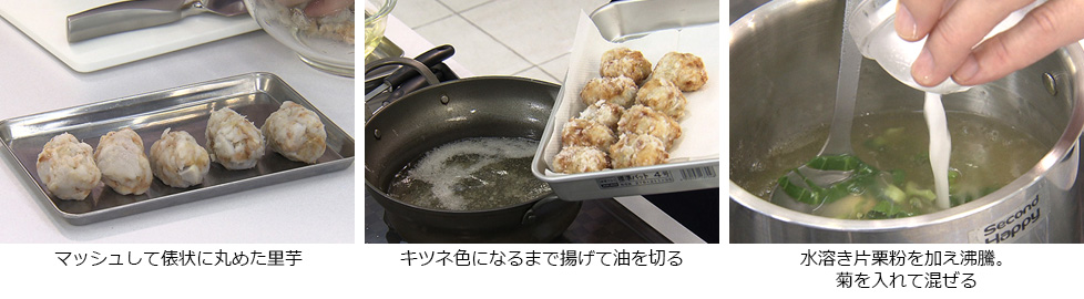 - マッシュした里芋に醤油と砂糖、カツオ節を混ぜて8等分して俵状に丸め、片栗粉をまぶす。
