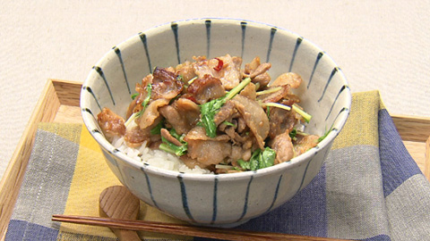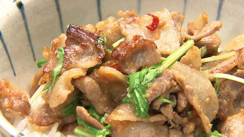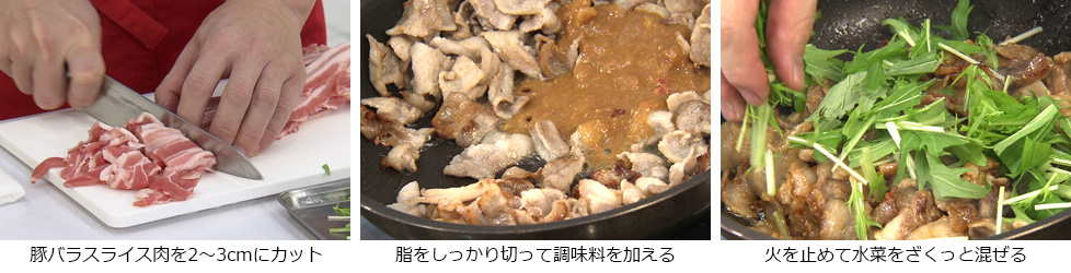 - 豚肉に焼き色がつくようにじっくり炒めたら余分な脂をふき取る。