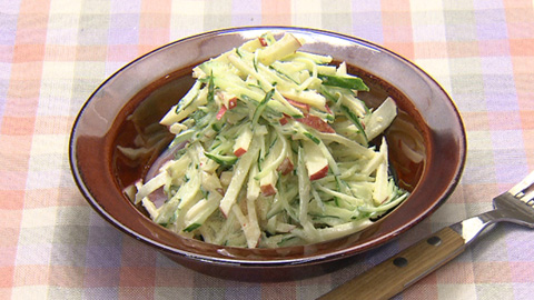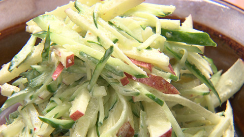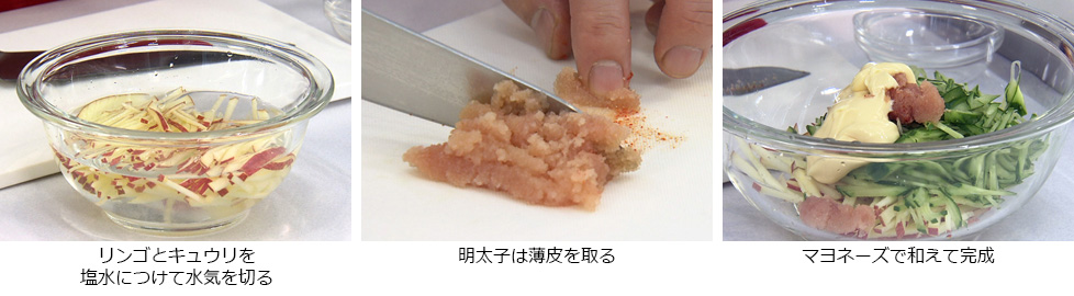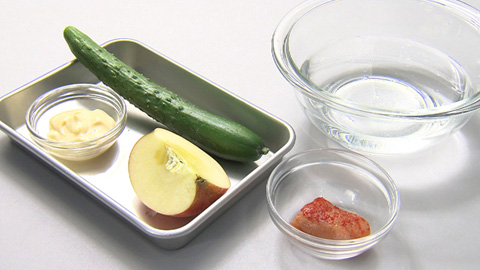 カットしたリンゴとキュウリを塩水につけて洗い、しっかり水気を切る。
