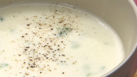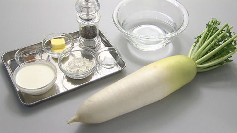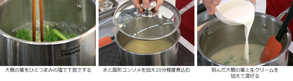 - 鍋に戻し、温め返すように火を入れ、刻んだ大根の葉と生クリームを加えて混ぜ、仕上げに塩コショウで味を調えほどよく温まったら完成。