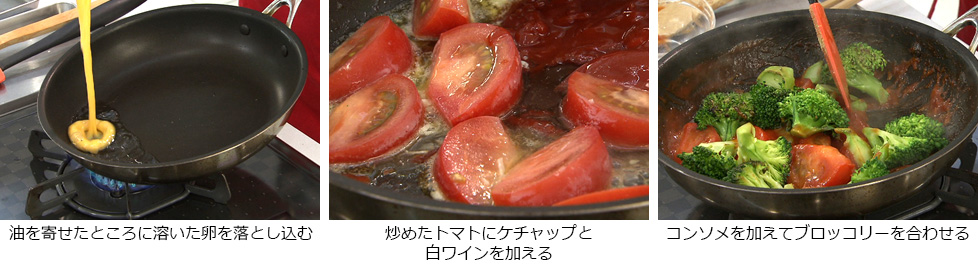 - トマトを加えて表面を軽く炒めるようにして、そこにトマトケチャップと白ワインを加える。