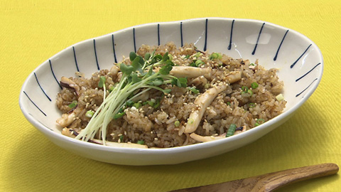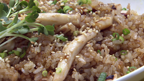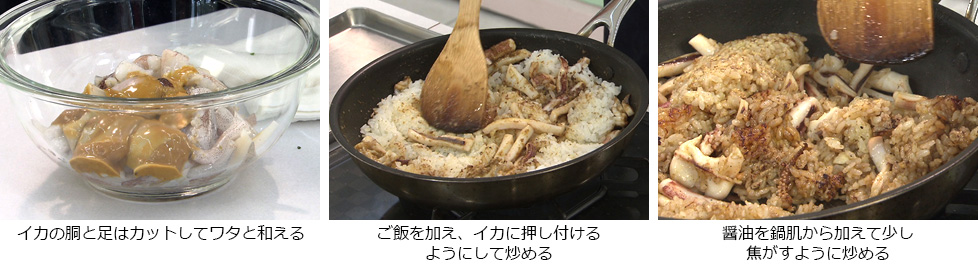- ご飯を加え、イカに押し付けるようにして炒め合わせる。